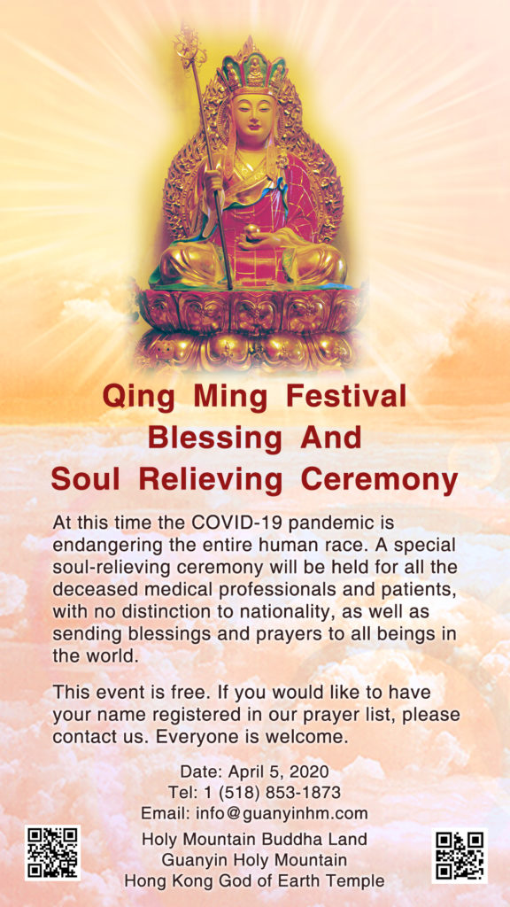 Blessing and Soul-Relieving Ceremony Calendar Add to Calendar Add to Timely Calendar Add to Google Add to Outlook Add to Apple Calendar Add to other calendar Export to XML When: April 5, 2020 all-day 2020-04-05T00:00:00-04:00 2020-04-06T00:00:00-04:00 Where: NY Cost: Free Contact: Iris 5188531873 Email Buddhist Celebration buddhism COVID-19 disease harmony Health peace Qing Ming soul relieving