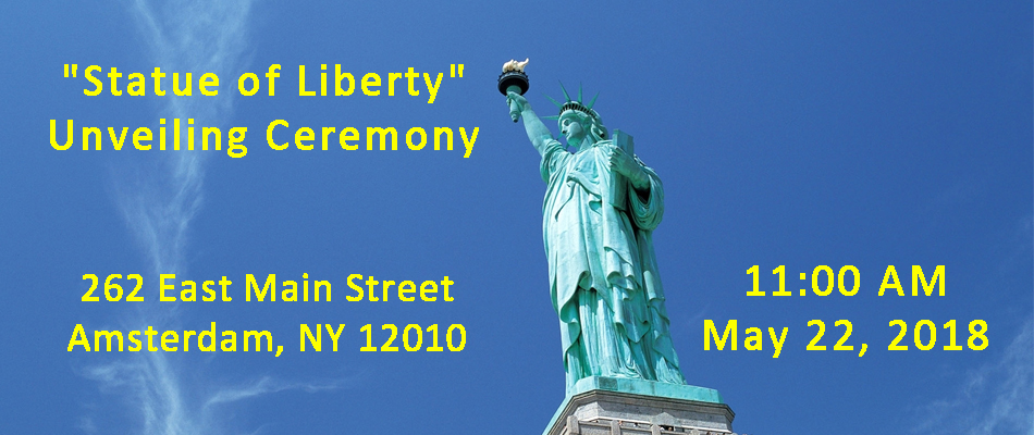 We would like to invite you to attend a special “Statue of Liberty” unveiling ceremony in Amsterdam. We would be honored to have you attend this event and witness the unveiling of the new replacement statue. The ceremony will be held this Tuesday, May 22nd, beginning at 11:00 AM at 262 East Main Street, Amsterdam, NY 12010.